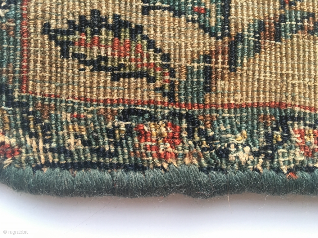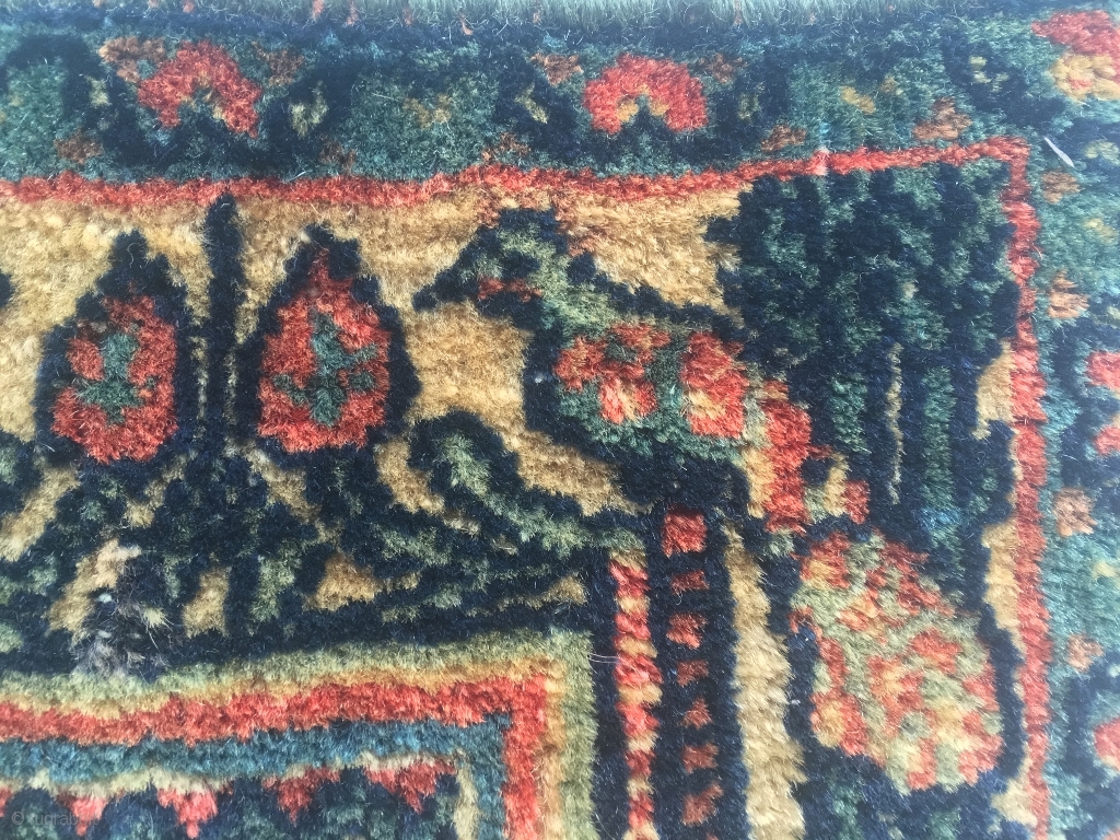 Sweet Kirman all silk mat, possibly started out as a chanteh given the wear on the lower side, suggesting it has been folded. Childlike drawing, could have been the treasured possession of a little girl. Size 22 x 19 (8.66 x 7.48). Deep patination.