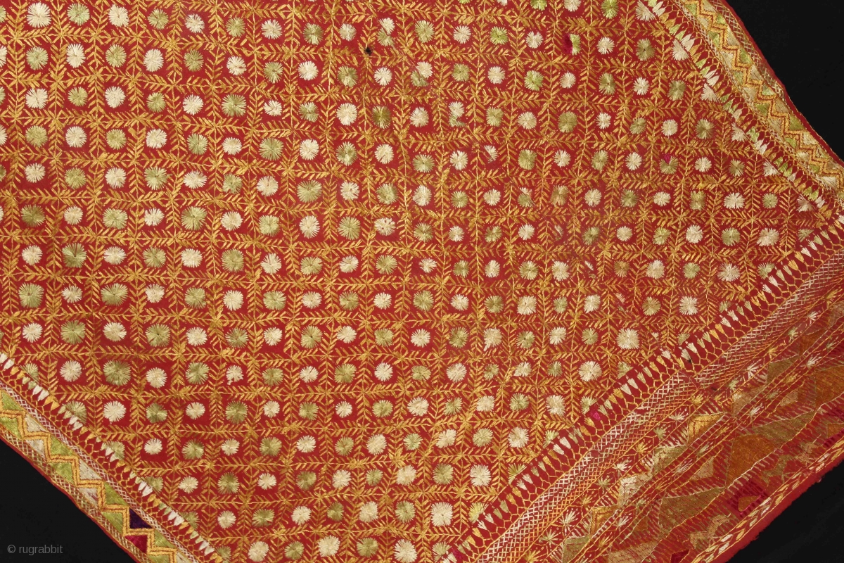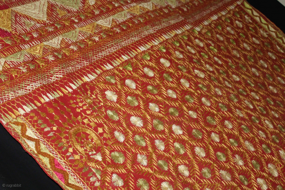 Phulkari From East(Punjab) India Called As Phulkari. Rare Surya (Sun)Design,placed as a konia at the corner of the pallu. Extremely Fine Phulkari.Its size is W-117cm x L-234cm.(DSL02680).