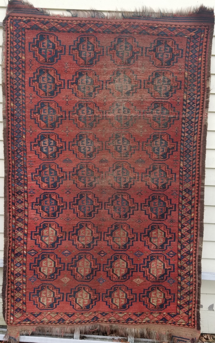 Ersari Afgan - about 5.9 x 3.10 (not including kilim remnants). Central wear. No repairs. Nice use of green.