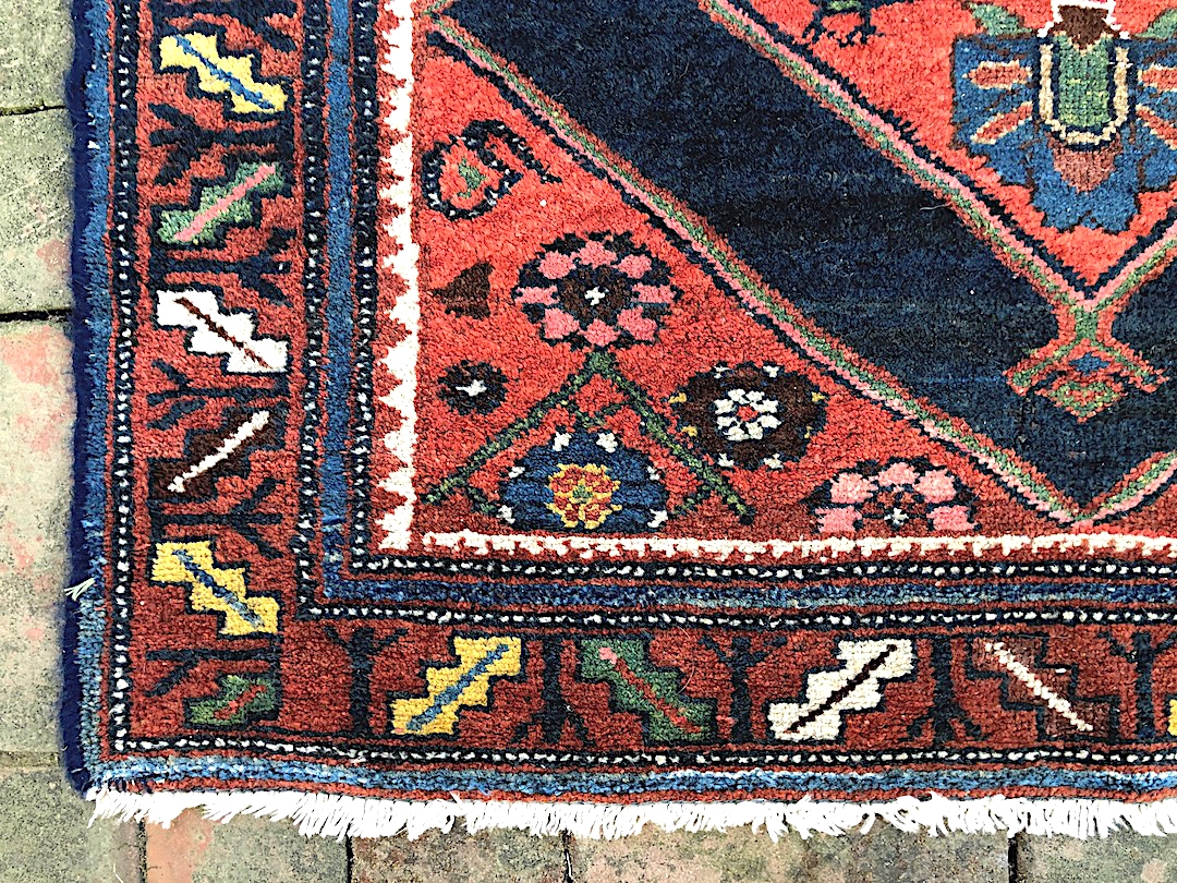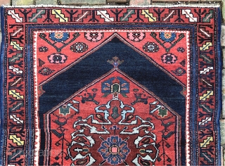 Malayer-- approx 3.1 x 3.8-- Calling this Malayer for lack of anything better. Probably West Persian Village piece and has kurd influence. An interesting graphic old piece. Gets lowish in center. Call me for in hand condition report. $15 shipping. Please check out recent pickings: http://www.montaine-antiques.com/oriental-rugs/