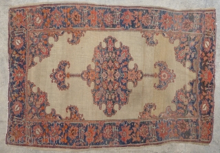 Antique Fereghan / Farahan / Ferahan rug. Late 19th century to early 20th century. Beautiful design with interesting small secondary borders. Most colors are probably natural though one end has a different orange that is brighter on the back. Village production with some variation in width. Nice soft abrash in camel colored field. Clean(washed by hand).