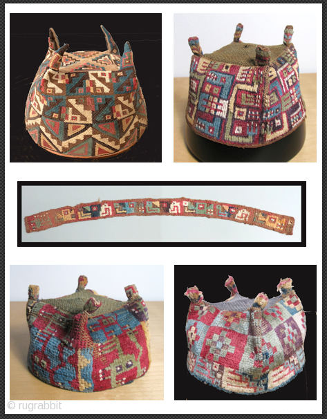 Andean pile and looped headdresses - a.d. 500 - 900. These are beautiful and precious with amazingly soft, lustrous fiber. It is rare to see such a superb group of Wari and Tiwanaknu hats available for sale at any one time. Pieces in this kind of condition don't come up often. Most are in museum collections. These are all well worth considering. More images of these pieces can be seen in recent posts on my pages. Scroll through and you will find detailed images showing different sides of each piece along with brief descriptions discussing each piece. Have a look. Enjoy.