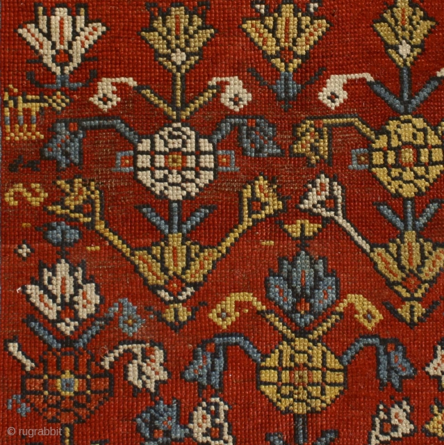 Quasghai sofreh ? dowry rug ? with lovely rustic charm, randomly drawn, strange symbols, creatures are defending the forest of blossoming pomegranate trees... unusually small size .. more beauties on sale: http://rugrabbit.com/profile/5160