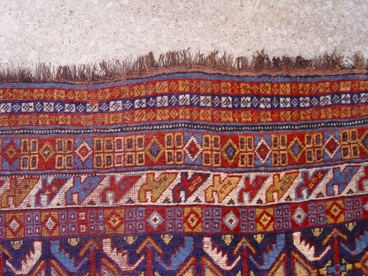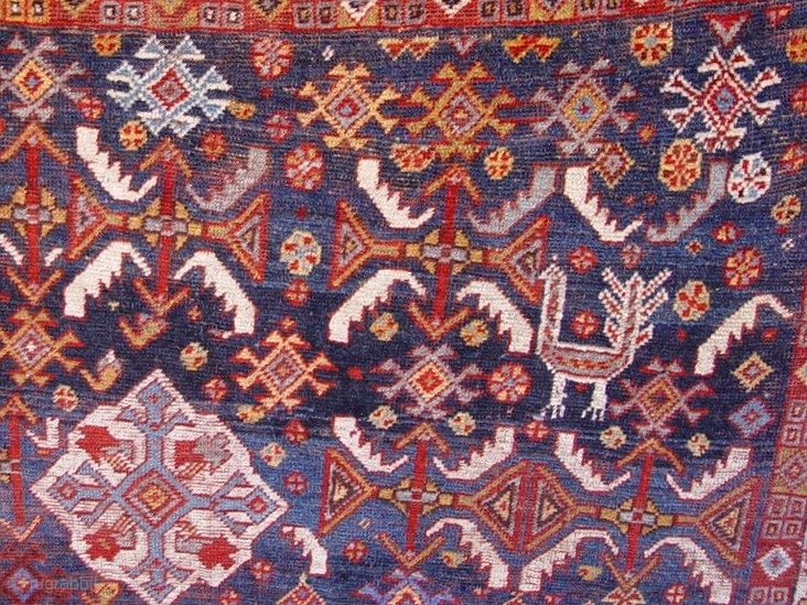 Antique Persian Khamseh , 4' x 7'8"ft. 122 x 324 cm. shows an image of one bird/chicken, good original condition, has some areas with lower pile, .