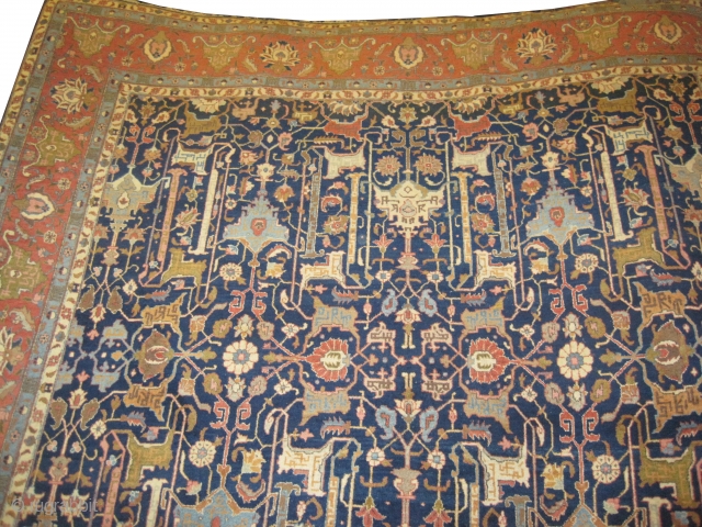 The black color is oxidized, the knots are hand spun wool, all over geometric design, the background color is indigo, high pile, perfect condition, fine knotted, decorative design and in its original shape.