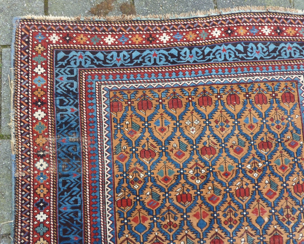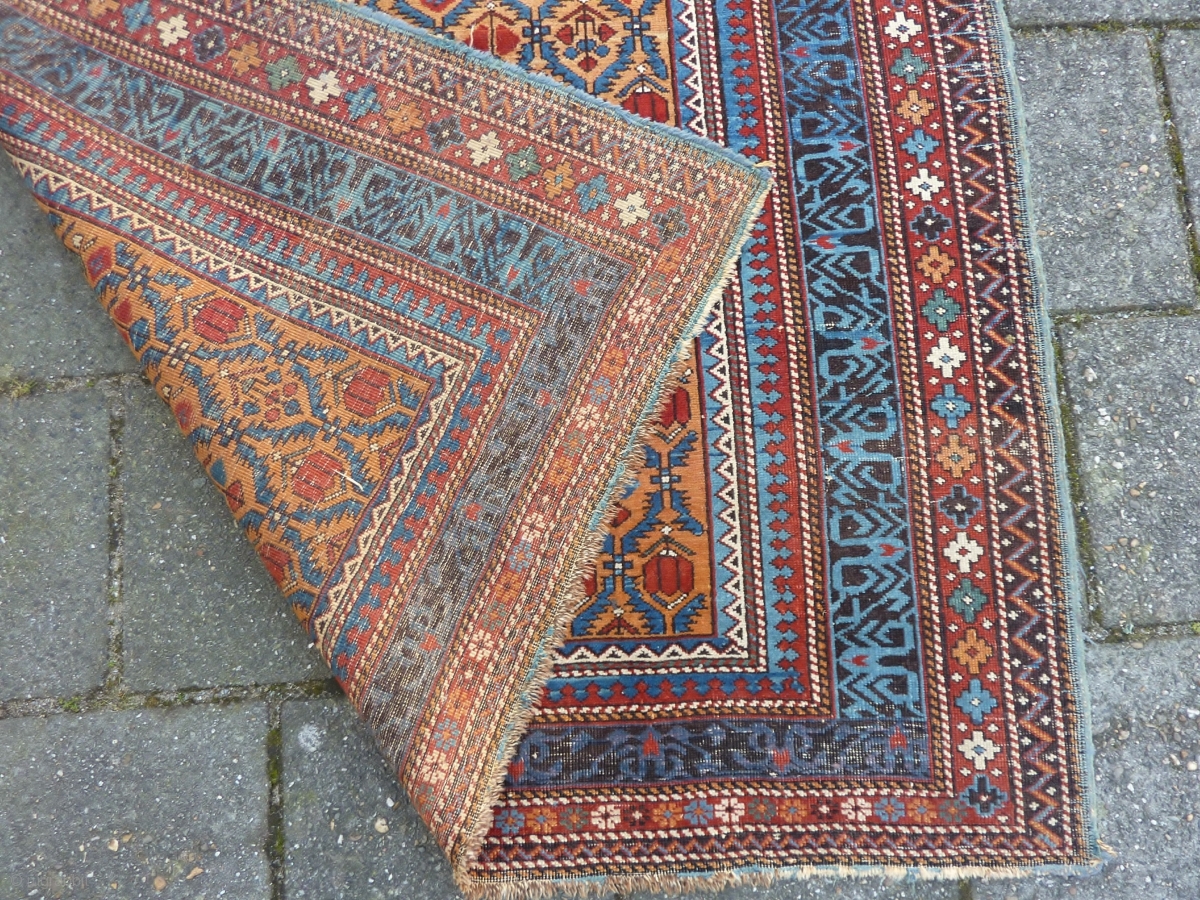 Caucasian Kuba Shirvan, 211 x 131 cms., end 19th c. Woolen warps, cotton wefted. With three localized areas of wear, as seen on the last three pictures. Selvedges needs attention. All natural dyes. Clean.