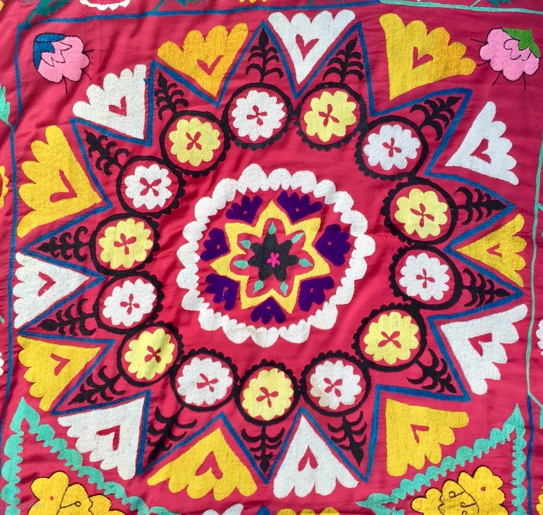 Description and origin: suzani embroidery from Uzbekistan with traditional flower design.