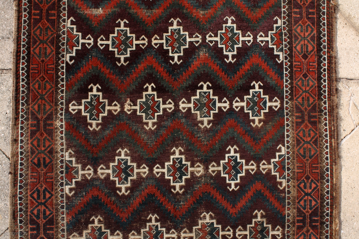 deeeeeep deeeep aubergine, cherry red, peach, turquise and dark green ... what else would you need on a baluch rug? Zabol / Sistan (?) baluch .... stylized human figures (?) waving on a deep aubergine ground ... i've never seen that field before ... did you?! very strong turkmen influence ... with original kilim end decorated with sumakh weave ... . more pieces: http://rugrabbit.com/profile/5160