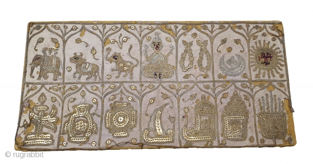 Sutra Book Cover An Jain Aari Mochi (Real Zari) Embroidery on the Satin Silk,Embroidery From Kutch, Gujarat. India.Showing When Mahavira was born his mother Trishala, During her pregnancy,Mother was believed to have had a number of auspicious dreams, all signifying the coming of a great soul.C.1900.Its size is 19cmX37cm(20190302_130346).