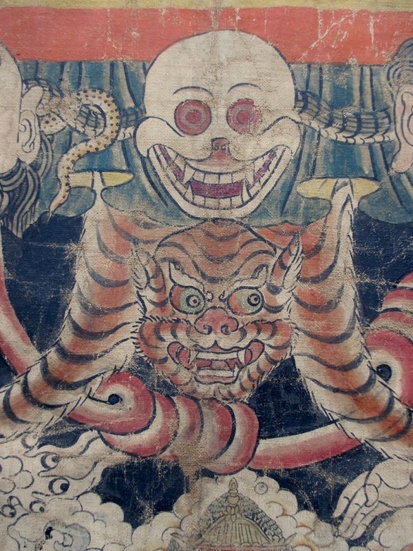 A long Buddhist Thangka fragment, the top corners with remnants of the fixtures once used for hanging. One side of the cloth is painted with hanging human and animal skulls and skins intertwined. Skeletal faces of the Citipati hang amongst the human heads, their skeletal form serving as a reminder of the impermanence of life and eternal change. Below the hanging heads and skins are lingzhi clouds carrying the bodhisattvas with their heavenly attendants and offerings.