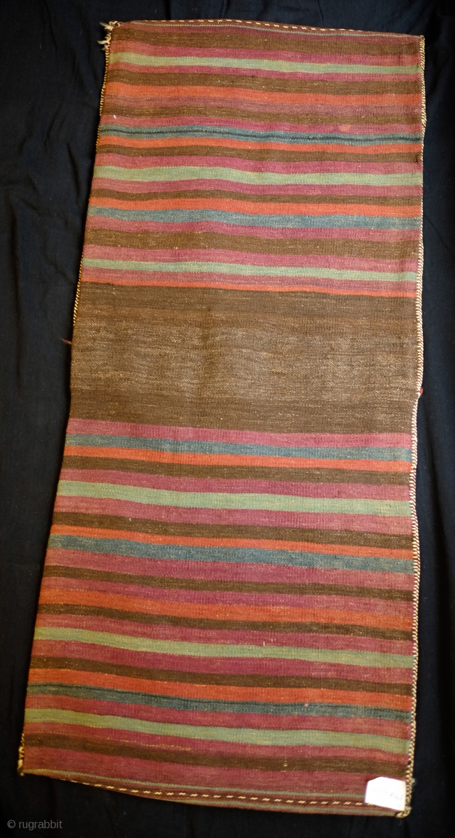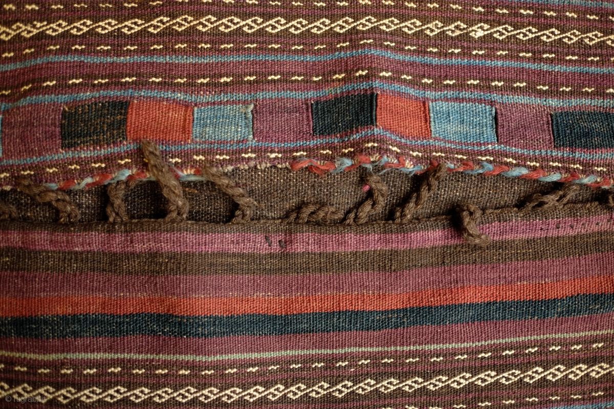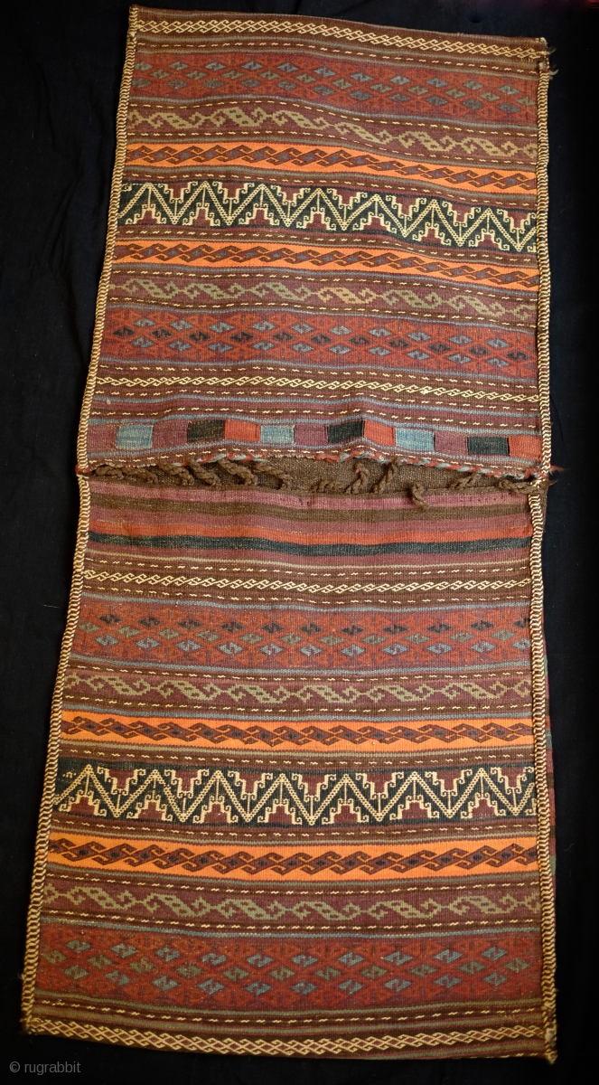 Kohistani saddle bag from Badghis area of Afghanistan. Late 19th Century. This has a beautiful striped back in natural colors. Colors are all good. Some of these bags started to come out during periods of hardship such as the drought at the end of the 1970s and in more recent times. 68 x 148 cm.