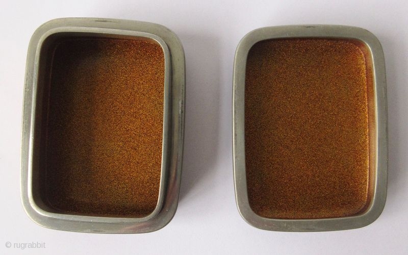 Japanese lacquer incense box with low-relief designs of plum blossoms in maki-e lacquer on finely sprinkled nashiji lacquer ground. The plum branch pattern is continuous along the sides of the box. The base and interior of the box are finished in fine nashiji lacquer, and the space where the lid and base join together is done with silver.
