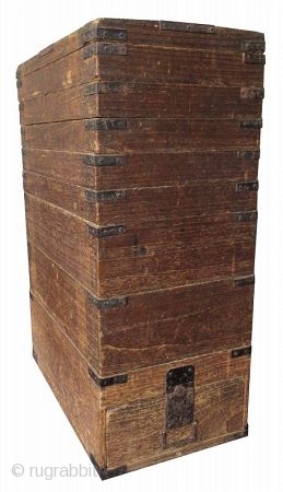 Unusual Japanese Kiri wood stacking box, comprised of 9 shallow compartments for the storage of calligraphy implements. The edges of each compartment are reinforced with hand-forged iron plates. The lowermost compartment has a single pull out drawer with a kakute iron pull and lock.