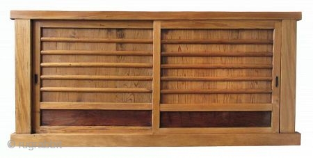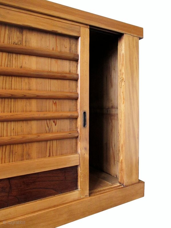 Antique Japanese single section mizuya (kitchen tansu) made of sugi (crytomeria) wood and finished a light natural color. The large single compartment is opened by two sliding panels with details made of keyaki wood and rounded horizontal rounded slatsof sugi wood.