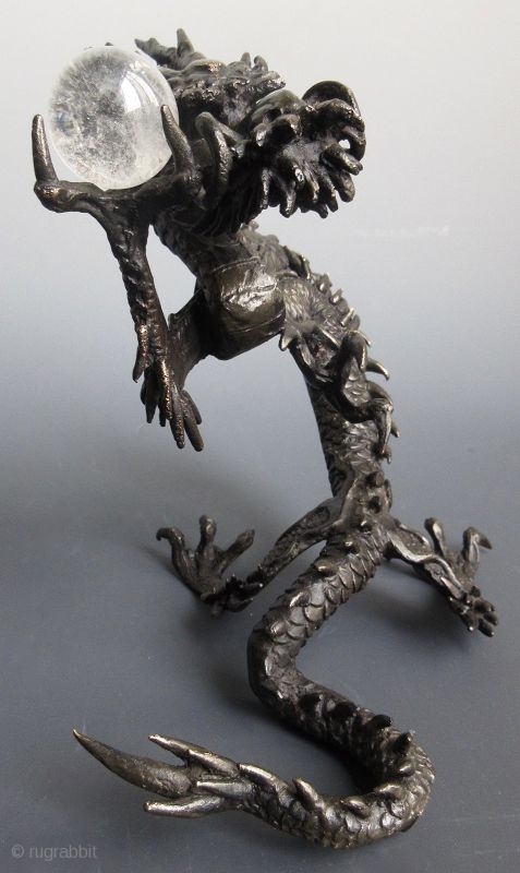 Japanese bronze sculpture of a coiling dragon, holding a clear quartz crystal ball in its raised claw. The foot is cast with the two character seal of the artist.
