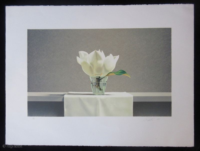 a photorealist lithograph print, still life study of a magnolia. Numbered 5/11 in its series in roman numerals. Signed Guy Diehl in pencil.