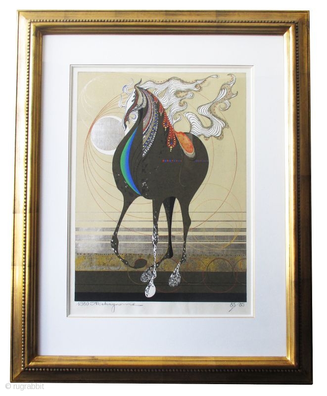 Large Japanese woodblock print of a horse by the artist Nakayama, Tadashi (born 1927). Titled, "Cyclone". This image of a horse stands with it's mane billowing with bits of color and metalic leaf. The head of the horse is patterned with colors while most of the body remains a dapple of charcoal and white. In the background, a series of thin circular lines accent a metalic leaf sun or moon. Signed in pencil and numbered 85 of 85. Framed.