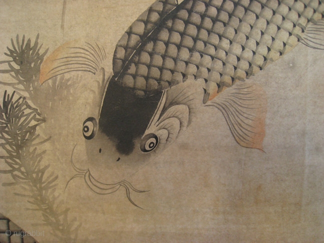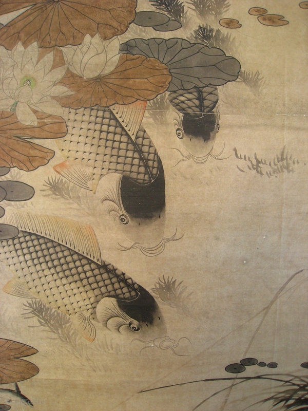 Antique Chinese scroll painting of 5 large carp swimming in pond with lotus and other water plants. Painted in ink and light colors on paper. Artist signature and seal by Li Fang Yin (1696–1755), known as one of the Eight Eccentrics of Yangzhou.