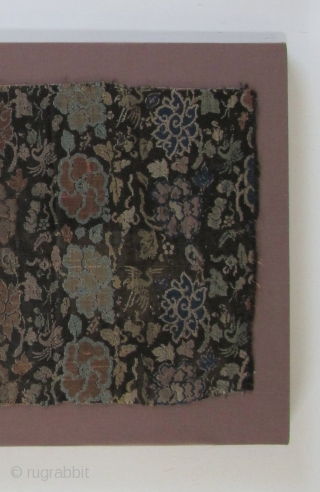 a gold brocaded silk weaving with flowers and cranes. Late Ming, most likely Wanli, ca. 1600. Dim.: WxL 30 x 76 cm (weaving). Mounted on brown cotton on foam board. There's no selvage left. a very colourful weaving with eight different hues. The flowers and leaves are bordered with flat gold but the gold has worn off. a fragment of good size in general good condition.