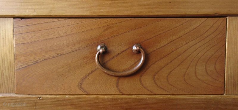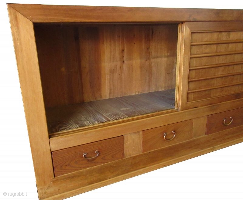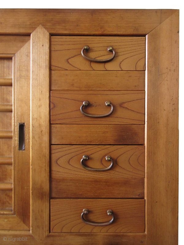Antique Japanese half section Mizuya, or kitchen buffet tansu, made of Hinoki (cypress) and Sugi (cedar) wood frame. The chest has bold Keyaki (elm) front drawers along the bottom and right side with copper handles. The large sliding front panels are reinforced with attractive horizontal slats, and open to the large interior compartment.