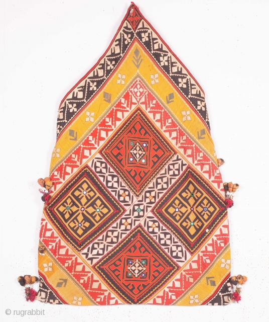 Dowry Bag (cotton) from Sindh Region of undivided India. India.Applique cut-outs with mirrors and the tassels.C.1900.Its size is 58cmX88cm. Rare Kind of Bag(IMG_5151).