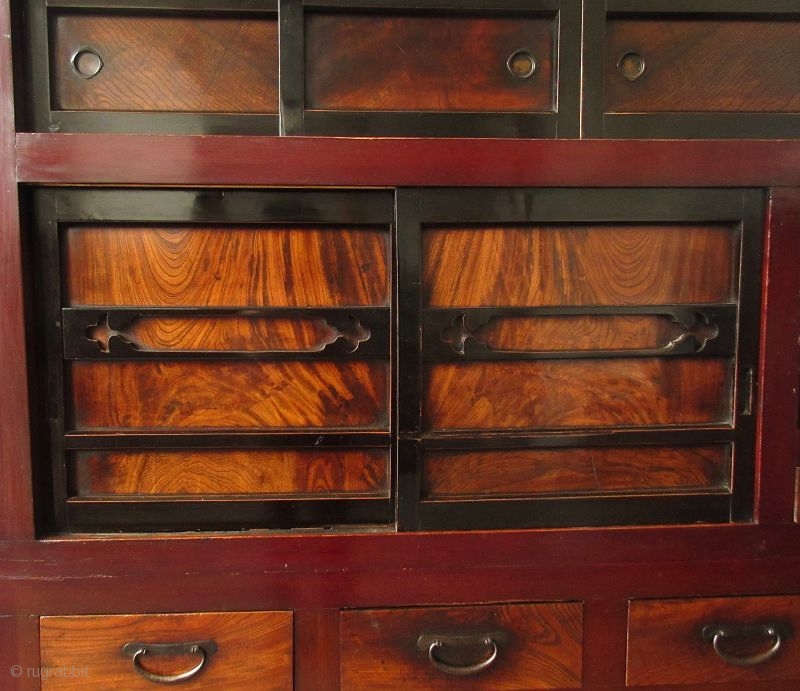 Antique Japanese 2 section 6ft Mizuya with dark red lacquer frame made of Hinoki (cypress) wood, with Sugi (cedar) sides, and Keyaki (elm) burl hardwood front panel drawers and sliders edged with black lacquer frame. From the Kanazawa region. Kanazawa is the capital of Ishikawa Prefecture, on Japan’s central Honshu Island. It's known for well-preserved Edo-era districts, art museums and regional handicrafts.