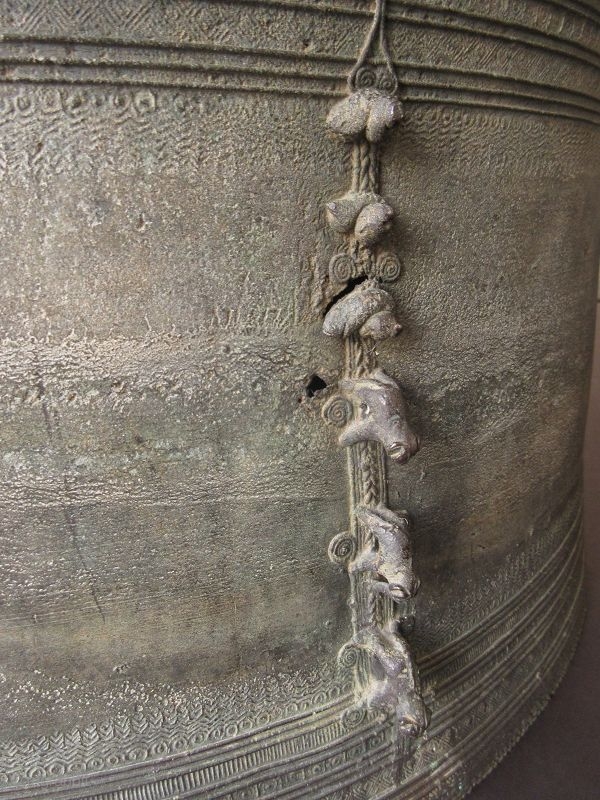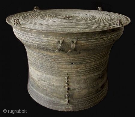 An unusually large size bronze rain drum from Laos, a Herger type three drum. Reference material "The Karen Bronze drum of Burma" by Richard m. Cooler. It has an unusual 3 frogs (twelve altogether) on top with a twelve pointed star with continuing concentric circle with stamp decoration. The side has three elephants and three snails representing water and fertility. a globular flared body rises with four attached handles of frog design. Circular concentric pattern continues throughout the body. The patina is a complex pale verdigris to buff in color. Small losses.