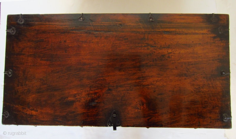 a rustic and simple Korean Bandagi chest made of elm wood. The exterior of the chest contains decorative iron fittings and handles. The interior of the chest contains three small drawers on the top area of the interior and a large space below to store a blanket.
