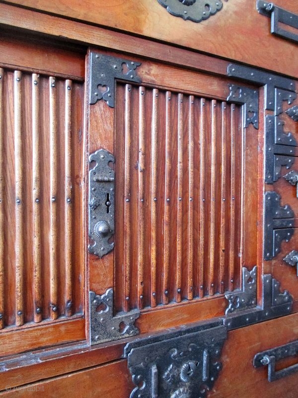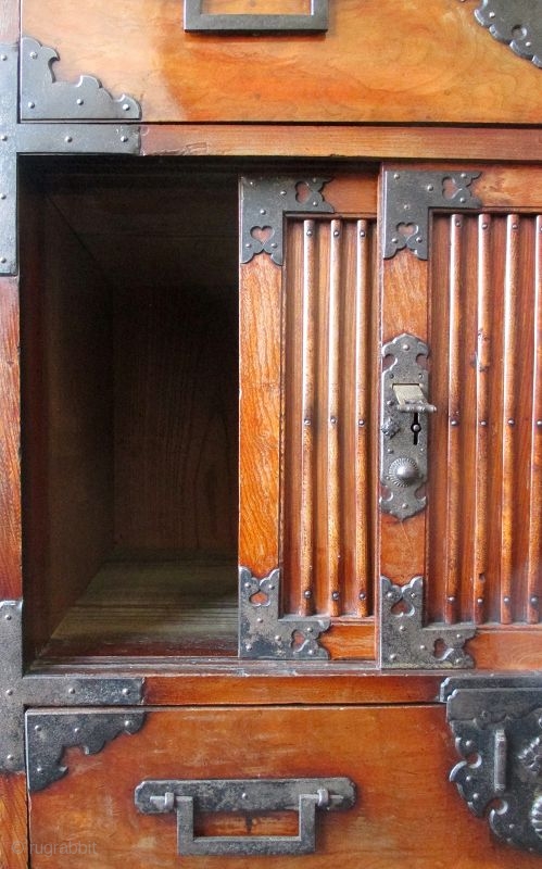 Antique Japanese choba tansu made of solid quartered sawn keyaki (zalkova) wood with burl wood front. The upper portion of the tansu has a large full-width drawer and another full-width drawer on the bottom. The right hand side has three small exterior drawers. The middle section has sliding panels with unusually fine vertical slats. The interior has 3 small drawers in a vertical row. All original lacquer finish and iron hardware including square drawer pulls and elaborately cut out lock plates.