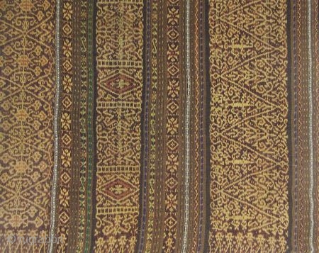 a framed Indonesian sarong, a long cloth worn as a wrap skirt, hand-woven with bands of intricate scrolls and medallion repeats. Made of warp irate, with natural dyes of blues and browns. Originating from Flores Island.