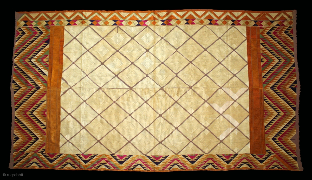 Phulkari From West(Pakistan)Punjab India Called As Chand(Moon) Bagh.C.1900.Rare Lahariya Panchrangi Pallu with Panchrangi Borders.Floss Silk on Hand Spun Cotton khaddar Cloth. Mint condition.(DSL03010).