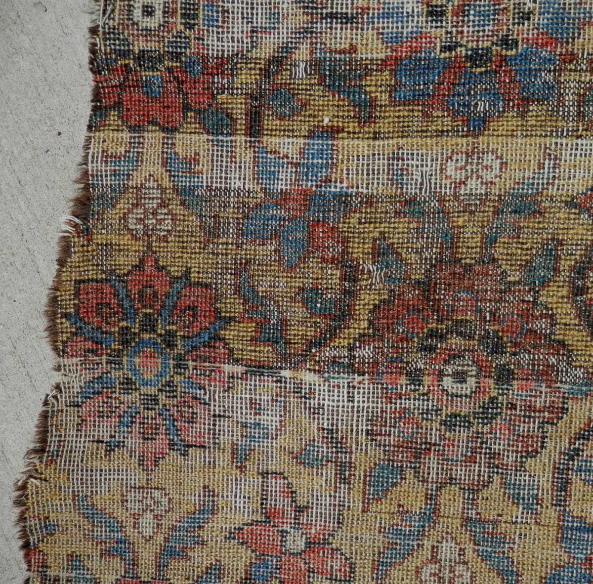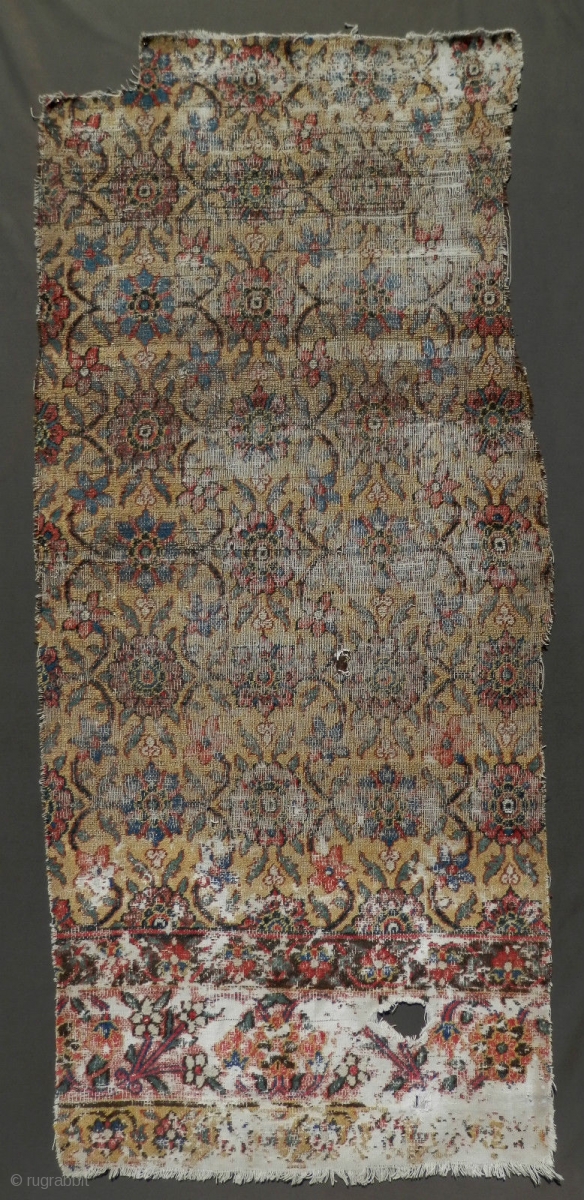 Minakhani fragment, late 18th century / circa 1800. Khorasan jufti knotted type a rare yellow ground. Worn but majestic. Size is 33'x75'