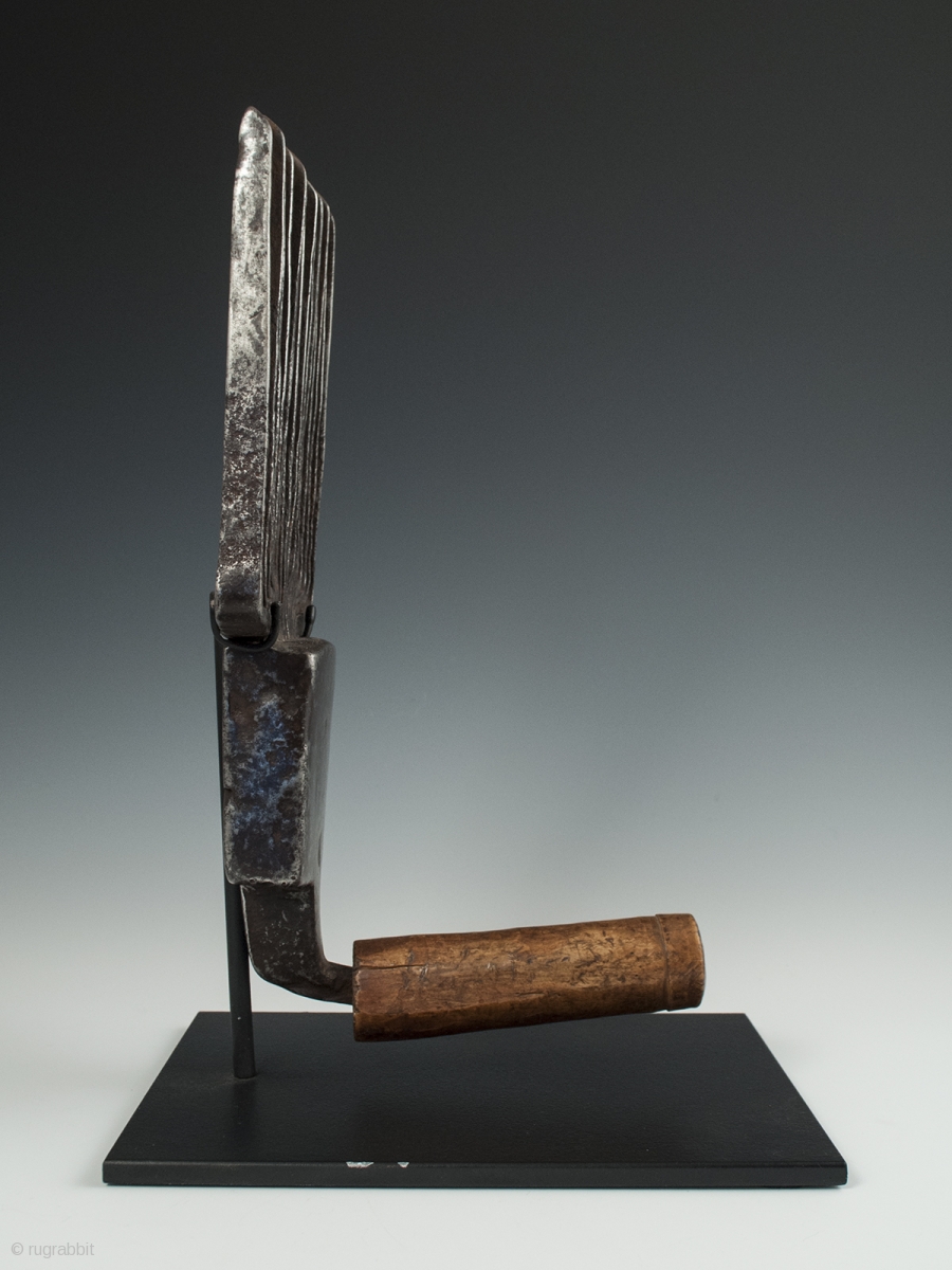 A traditional Berber beating comb used in the weaving process to tamp a row down before adding the next. Here's an interesting bit from the internet: From “Tapis Berbères du Maroc – La symbolique origines et signification”, by Bruno Barbatti, acr Edition: "the carding tool and the comb thus have the same symbolic origin. The metaphors for the male sex. In general all instruments with teeth are tinged with sexual symbolism in the textile craft of the Berber. The repetitive movement when using them is associated with the sex act".