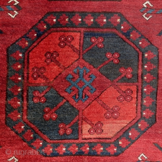 Antique Ersari rug, 284x234cm, glowing, saturated colours, with beautifully drawn and unusually simple secondary gols. Lots of lazy lines, goat hair warps. Condition as to be seen, mostly good pile, some areas with low pile.