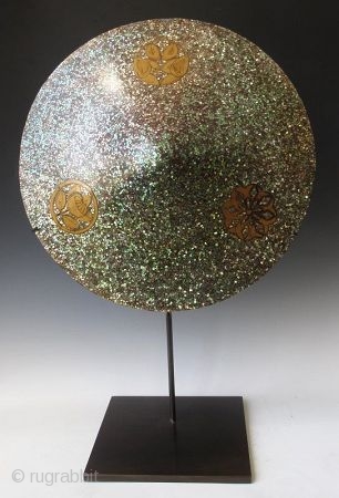 Circular jingasa with a gradual domed top. The composition is of bamboo, paper, layers of lacquer work with intricate shell inlay. The jingasa is decorated to the edge of three gilt lacquer circular crests (mon) The interior is finished in red with its original cotton gear straps and cushion. Mounted for presentation on steel plates.