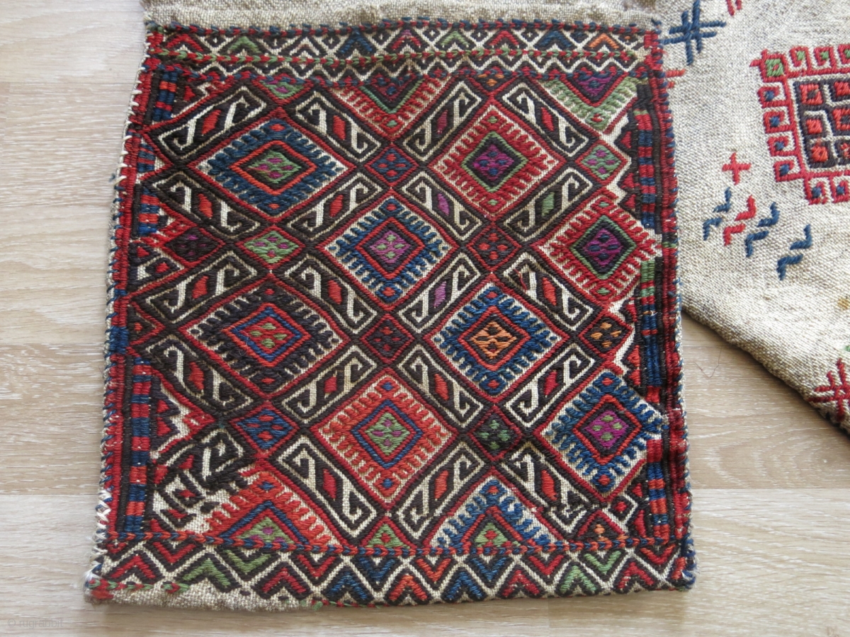 a very nice sample of Turkish kilim saddle bag, with a traditional weaving technique called zili. It is from Konya region, Central Anatolia. Circa 1930-40s. All wool with some natural some unnatural colors, hand spun wool. It has some minor repairs in the white area and some stains in the back as can be seen in the photos.