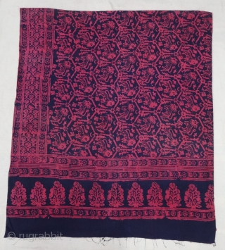 Saree Block-Print (batik) Cotton, From Kutch Gujarat, India. This is very rare kind of saree worn by the older lady of the house,(Like Grandmothers) known as ”Sadlo”.In Gujarati Language we use to say this Do-Dhiyo Sadlo. C.1900.its size is down Side long 415cm,down side wide-90cm, Pallov side wide-180cm(DSC06358).