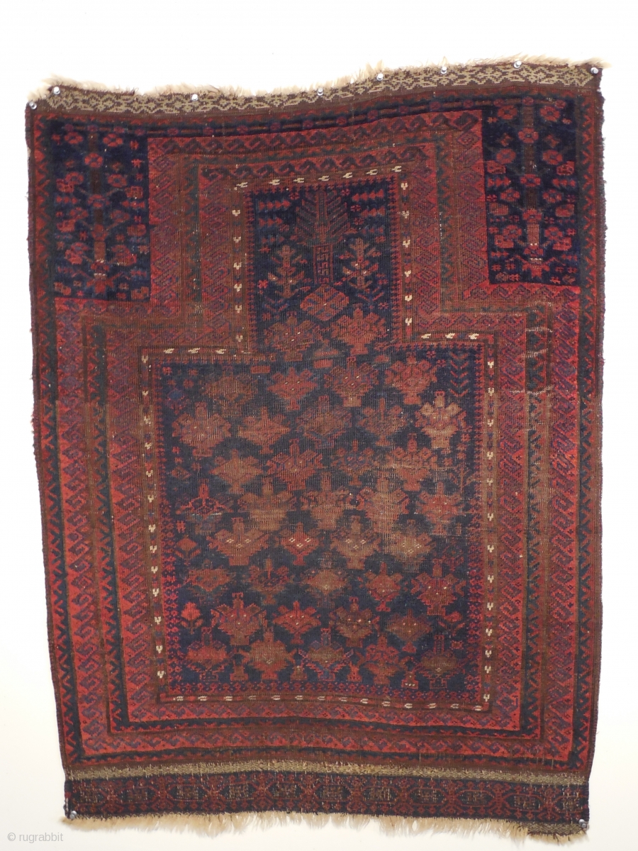 An early Timuri, Baluch prayer rug. Ca. 19th century. a finely woven blue ground prayer of exceedingly rare type. The wool quality along with very well saturated dyes and elaborately detailed design makes this a very beautiful and desirable rug for any Baluch collection. The detail of the field motif shows a row of pale blue cotton knots, seen only in early persian and surrounding region's earliest tribal weavings. The hand panels along with the design above, with a row of connected rosettes puts this prayer rug in a certain group of very specific prayer rugs. Please also note the elaborately done flat woven brocaded end panels. The top flat woven panel is familiar from other rugs while the elaborate bottom skirt in flat woven design is unfamiliar and possibly unique to this very elegant prayer rug. The zoomorphic design of the bottom skirt is very intelligently drawn and demonstrates the weaver's command of this specific design's understanding. The rug has been superficially washed, will improve dramatically by having it Newmanised. The condition is obvious from the photos, its been stabilized with dark brown thread along the ends and sides. No other repair. The pile is low in the field from use it was intended for. The hand panels, mihrab and the borders along with parts of the field are in excellent condition. This prayer rug has an oily handkerchief like handle, very pliable and soft wool.