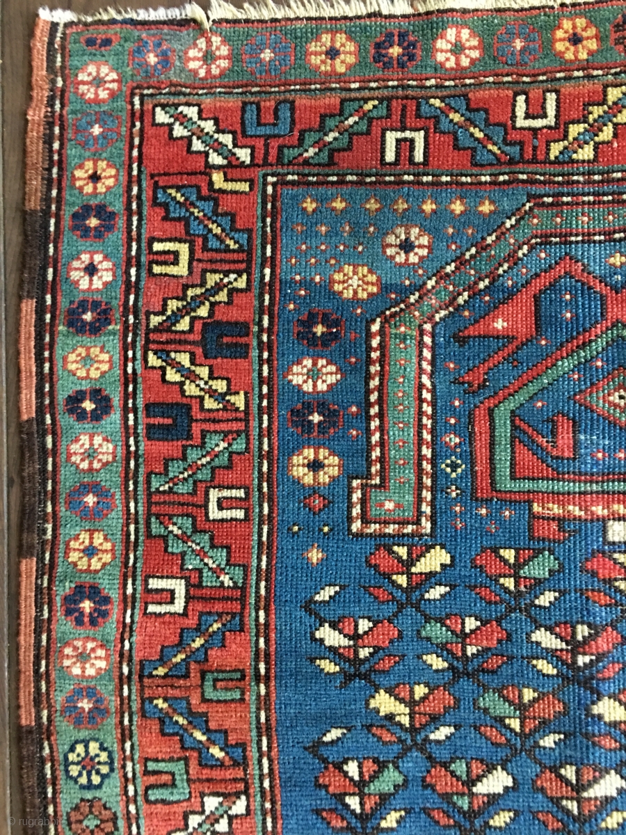 Colorful Antique Caucasian Shirvan or Shirvan-Kuba Prayer Rug from the late 19thC. Some wear with medium to full pile throughout. All natural colors with nice abrashes and several blues, greens and a bright lemon yellow. "Floating" mihrab. Original selvedges and the ends have been stabilized with a blanket stitch. Measures 57" x 34" or 148 x 86cm. Shipping included within the u.s.