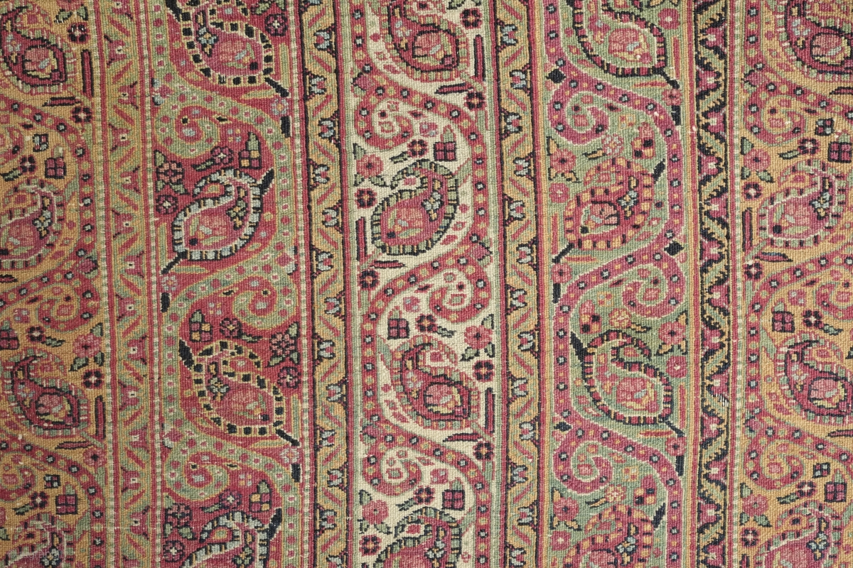 Mashhad Carpet, 3rd quarter of the 19th century. Kashmir shawl striped design. Very fine weave. Mellow, subtle colors with a wonderful soft green. 156 x 267 cm.