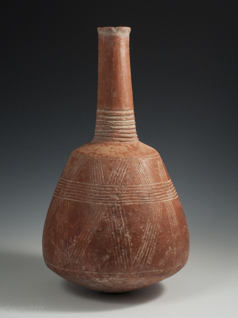 Terracotta Bottle, Djenne area, Mali, 15" (38 cm) high by 24.75" (63 cm) in circumference, late 19th to early-20th century. a handsome terracotta bottle from the Djenne area of Mali with incised geometric patterns on the globular body and incised rings around the narrowing neck. a few rim chips as might be expected.
