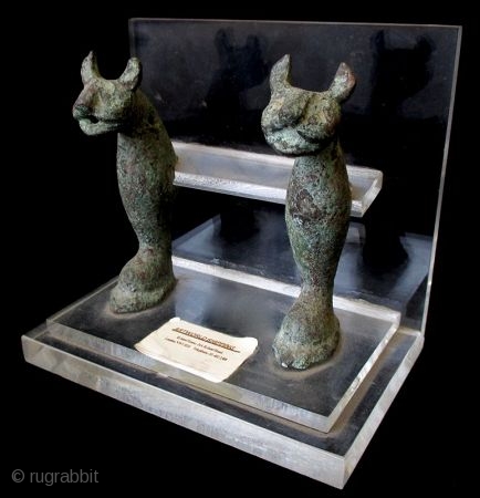 Egyptian bronze pair of cat figures with overall wear and green patina. Pierced holds through the mouths, heads, necks, and bases suggest they may have once been finials or other component to a large piece. On custom base.