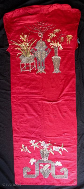 Chinese silk throne cover, with hand-embroidery of treasure vases, lotuses, other flowers, and a single butterfly in gold and silk thread against a red ground. The reverse is done in blue silk with calligraphy and cartouche signature. From Dodi Fromson Collection