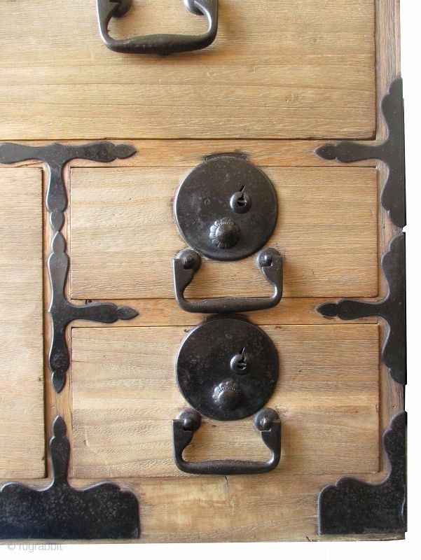 Antique Japanese isho tansu (chest on chest for clothing), made all of kiri (paulownia) wood. The top section has two large drawers while the bottom section has two large drawers with two small drawers in the lower right hand corner. The drawers, which are made entirely of kiri wood, have two hand holds cut into the interior sides for carrying. Hardware is made of blackened iron with round lock plates, corner and side bracing. The sides are outfitted with latching handles to secure the top and bottom sections together.