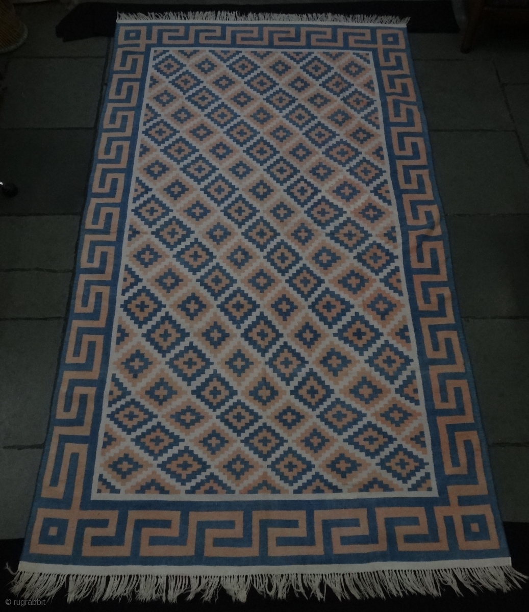 Jail Dhurrie (Cotton)Indigo Blue-white,Blossom Dhurrie with stepped Diamonds Design with key Border from Gujarat.India.Its size is (Big Size)175cmx304cm. C.1900.Its only used for some Festival time(DSC06549).