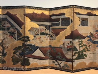 a mid-century 18th c Japanese Tosa school six panel byobu painted screen. Rimpa paint of gofun paper with gold leafed clouds dividing each of the scenes. The screen begins by exposing us to the art of seduction by listening to poetry. The proper approach to a desired lady was through poems written on scented paper of the finest quality by an elegantly dressed go-between of appropriate social ranking. Gifts are exchanged & elegant conversation is followed with the female dressed within layers of silk brocade kimonas. These kimonas allude to the sexuality of high ranking woman. The more obscure the body, the more erotic it becomes. The screen then ends with a privilege performance of Bugaku. The musicians play on a lake on Dragon & Phoenix boats representing Imperial social ranking. Each detail is done with the finest of attention & is overall in incredible original condition.