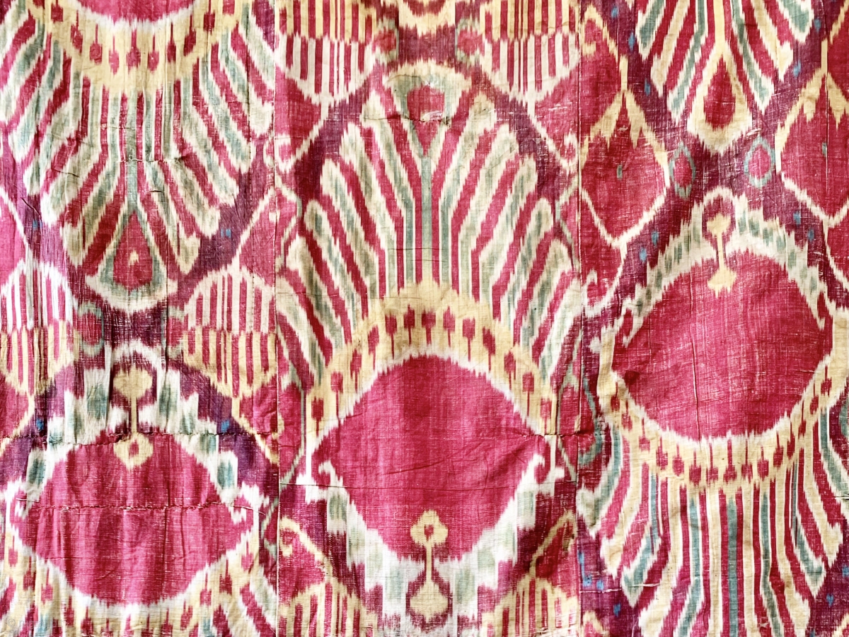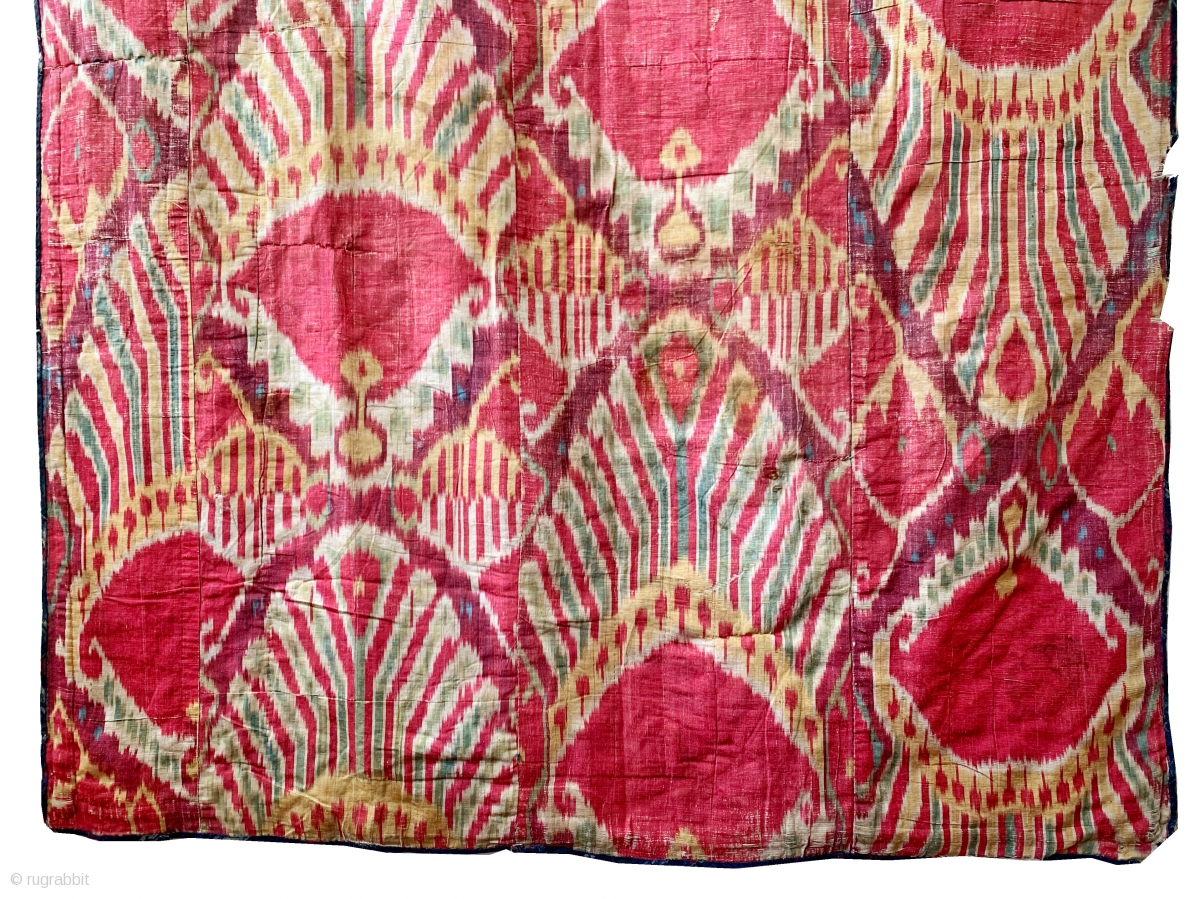 An outstanding and rare antique Uzbek silk adras Ikat hanging from Bukhara / Bokhara, dating to the mid 19th century. This very early example is a silk warp and cotton weft Ikat (a technique associated with older examples of this textile art form). It has an exceptionally intricate peacock design with gorgeous polychrome feathers surrounding a repeating tulip. Only a handful of such peacock design exists, one published in the Guido Goldman collection. This early design is executed through tie dye technique using six natural dyes. Often ikats with over five colours were considered as some of the most sophisticated examples because of the complexity of tie dye weaving. It has some abrasion in some parts and a few hardly noticeable wears stitched up and some patina as seen in photos. But it is expected of a piece over 170 years old. It has a gorgeous original block print cotton lining, consistent with the age. a real top end collection piece that doesn't come into market often and is offered at a reasonable price. size: 198cm x 140cm (6’6” x 3’2”)