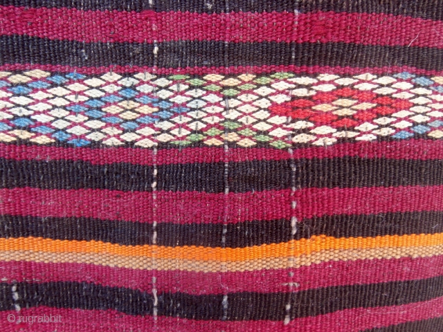 moroccan berber embroidered kilim, the colours and weave of which indicate that it was woven by the Beni M·guild Berbers in the Middla Atlas. It is old and very fine and was probably a dowry weaving before being folded in half, stitched and filled with stuffing, and spending its working life as a day time cushion and night time pillow. It will make a fascinating wall hanging or table cover. Reference 3037. Size 88 x 47 cms., or 33 x 19 inches. Euros 90.