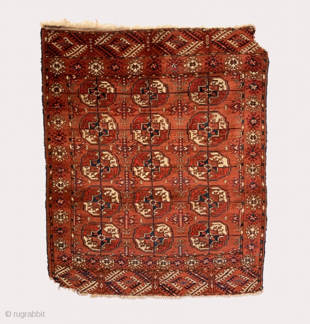 Antique Tekke Small Rug. 4th Quarter 19th Century. Small collectible piece. 15 central gul medallions sit on saturated brick red field framed by stylized geometric alternative indigo and ivory border design. Original condition with one small hole. 7 colors. 4’0” x 3’4”. Professionally hand washed.