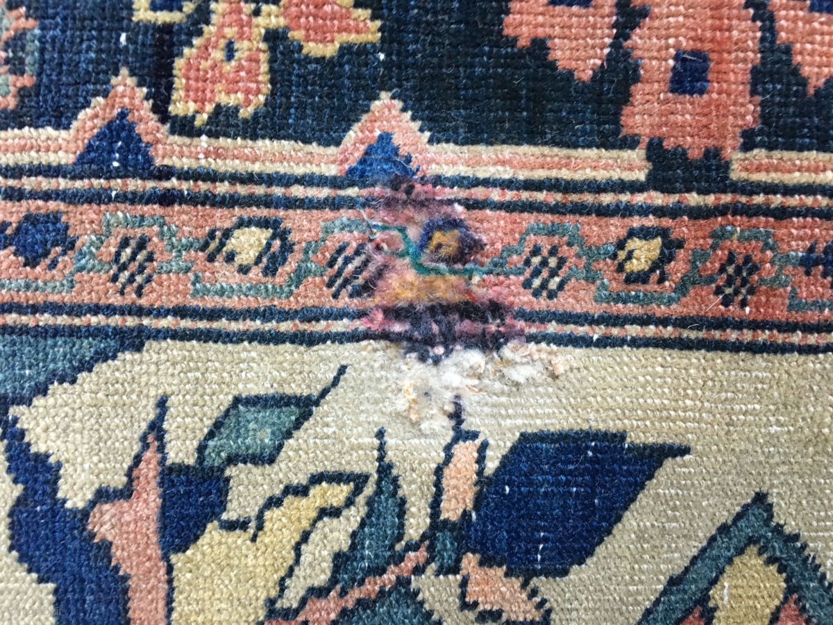 Beautiful and elegant Antique Ferahan Saruq small rug. From the 19th Century. Gorgeous design and natural, Saturated all natural colors. Very fine weave with approximately 300 kpsi. Measures 4'10"x 3'6"/147 x 107cm. Original selvedges. Low even pile with only one repair, a patch as shown in images 4 (front) and 6 (Back). Some fraying of corners at both ends. Shipping included in the u.s.